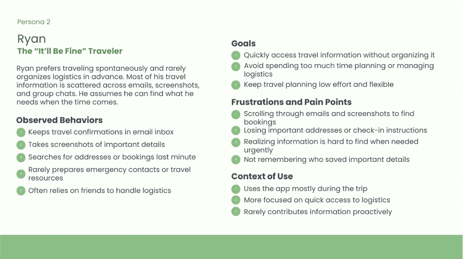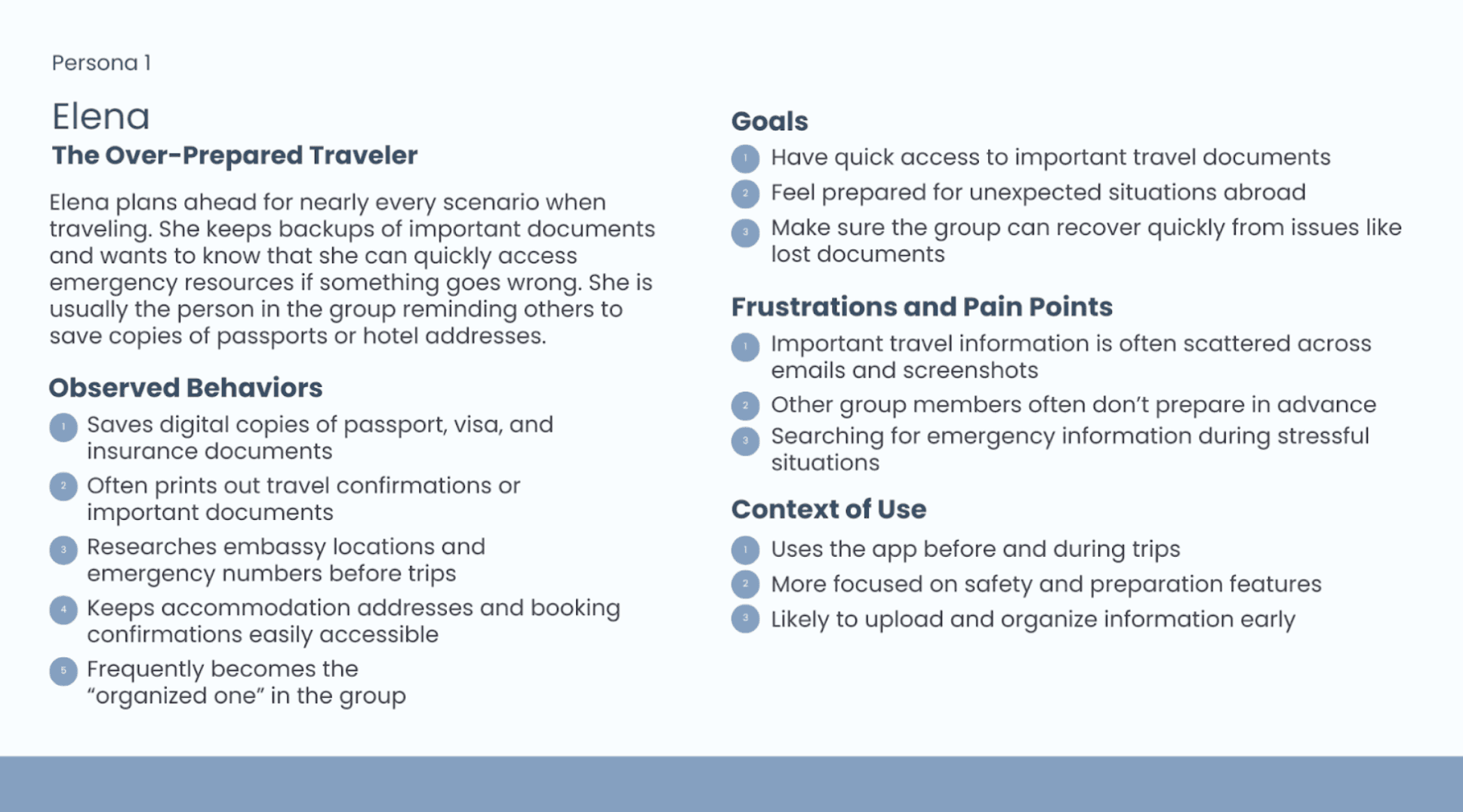 Rather than focusing on demographics, these personas are defined by how users prepare for trips, manage information, and respond to uncertainty. Together, they highlight the need for a system that supports both proactive and reactive behaviors, as well as varying levels of trust and coordination within group travel.