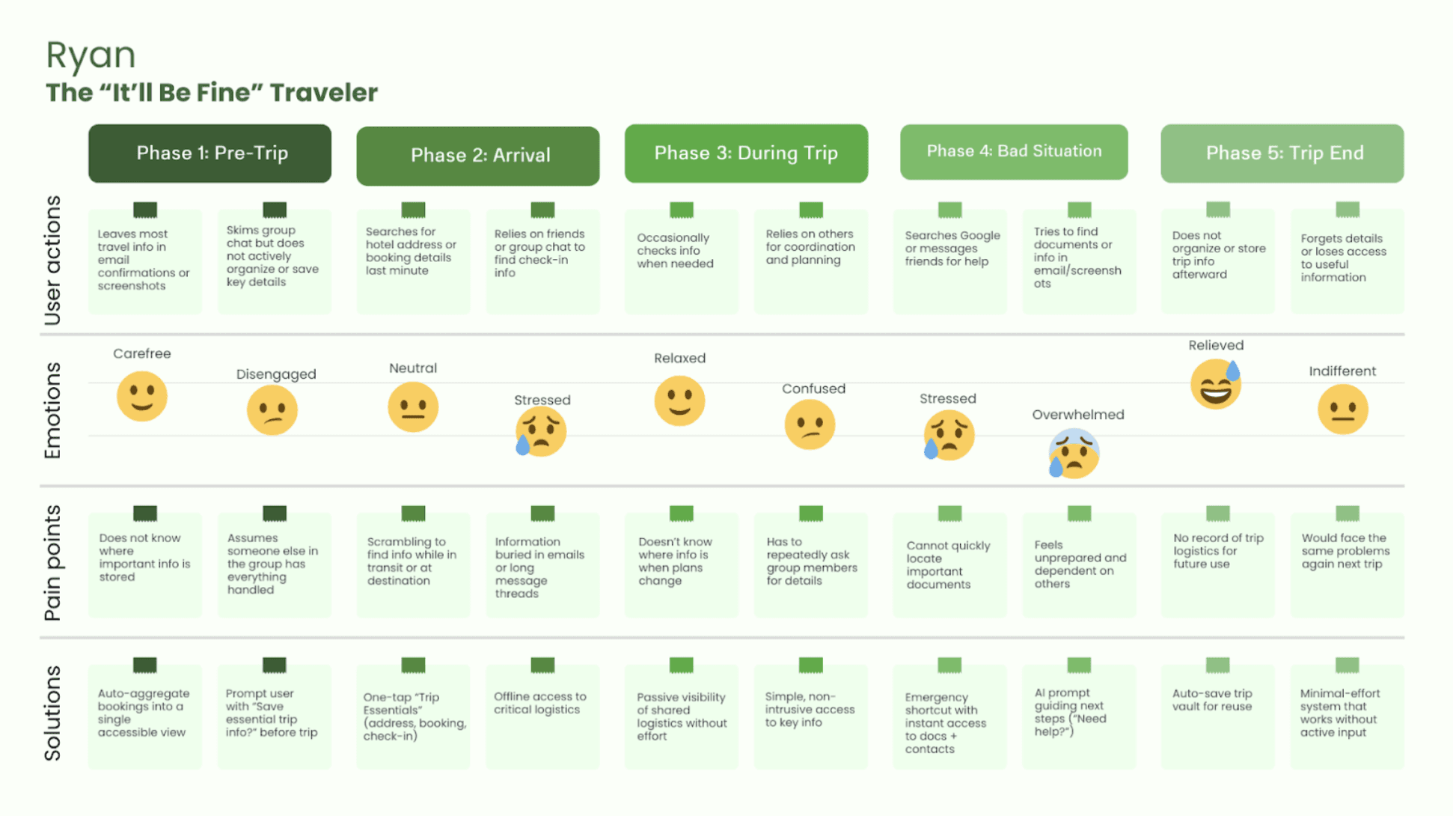 Overall, the research revealed a strong need for a centralized system that reduces information fragmentation, supports group coordination, and provides quick access to critical resources, ultimately making travel feel more organized and less stressful.