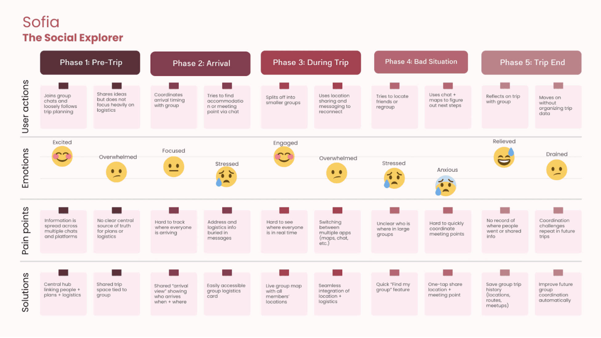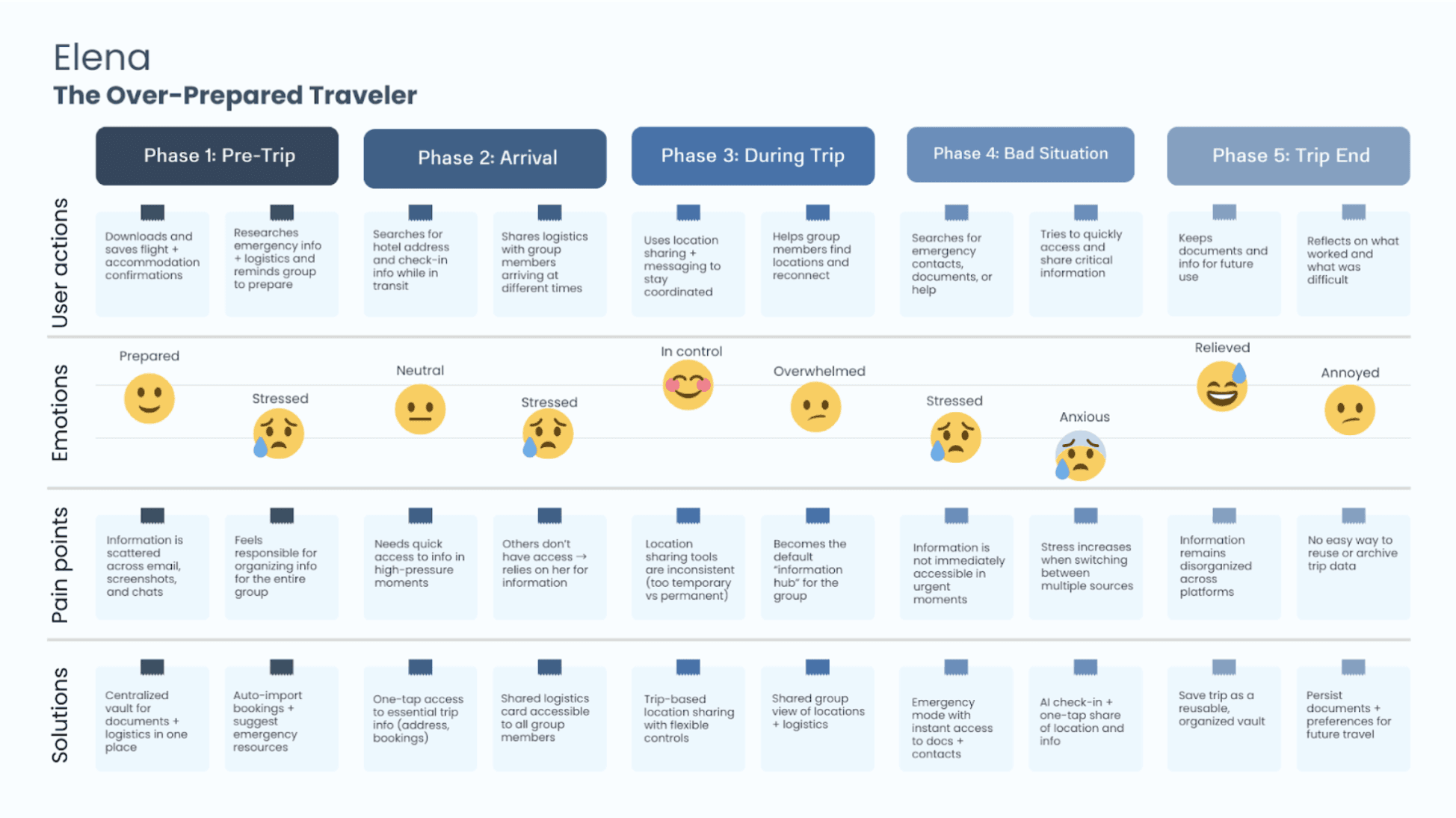 User journey maps were created to understand how safety and logistics challenges unfold across the full travel experience, from pre-trip preparation to in-the-moment navigation.