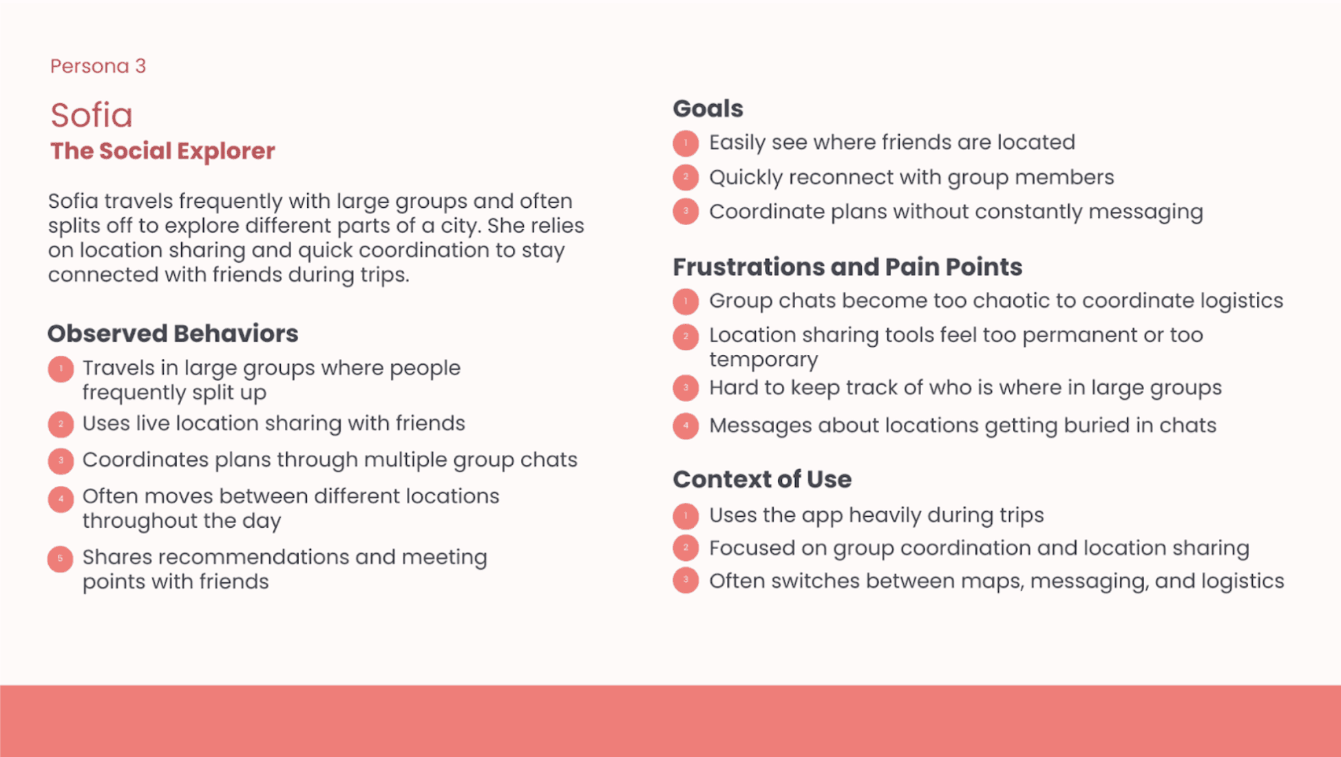 To further refine the design, I considered different user behaviors within travel groups, particularly how individuals engage with logistics and safety. Some users prefer to organize everything in advance, while others rely on more spontaneous decision-making. Additionally, group dynamics introduce complexity, as users may split up, rejoin, and navigate independently.